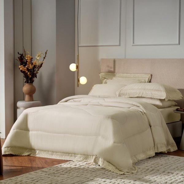 Edredom Casal Bordare Premium Appel Home mais um lançamento do Coordenado Bordare. Um produto de qualidade superior, com acabamento em renda bordado inglês, que é a característica principal dos Coordenados Bordare. Feito em percal premium de microfibra, o Edredom Bordare Premium é resistente, fácil de cuidar e tem um toque extremamente macio e é super confortável. Além disso, seu enchimento interno de 200g/m² faz desse produto um item volumoso e de alto conforto térmico.