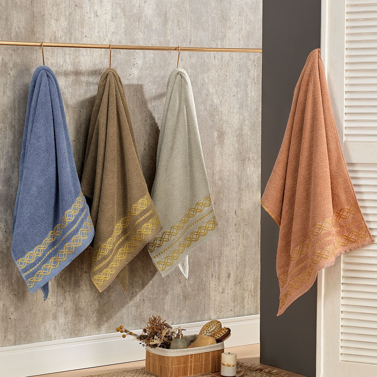 Seu design exclusivo apresenta uma elegante barra decorada com motivos inspirados na arte grega e delicados detalhes em jacquard com fio dourado, trazendo um toque de requinte ao seu banheiro sem abrir mão da funcionalidade que você precisa.