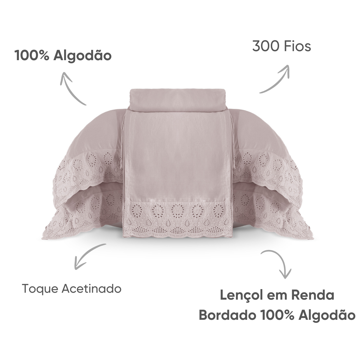 - Renda em bordado inglês de algodão nas fronhas e lençol superior;