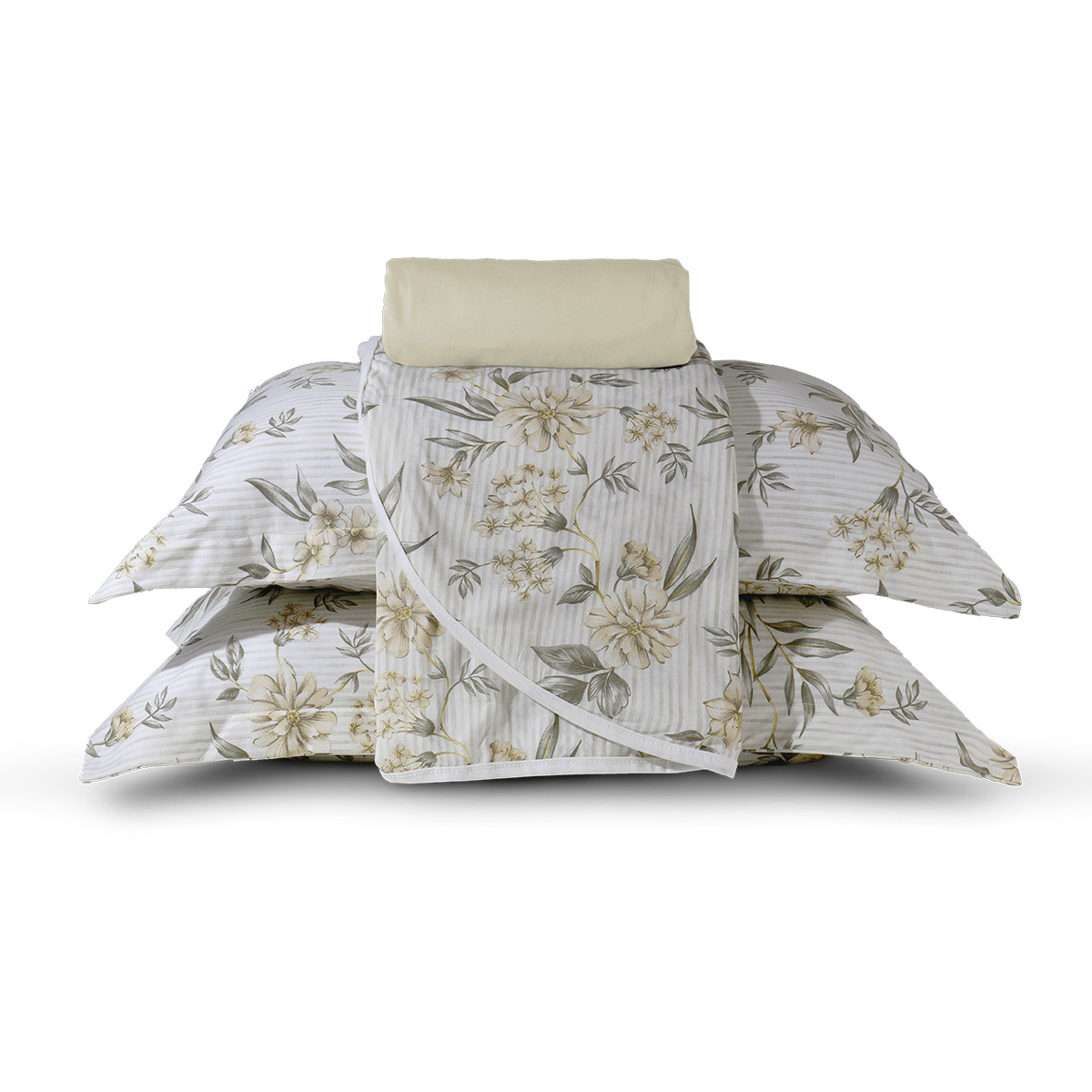 Com malha de 140 g/m², uma gramatura superior ao padrão de mercado, nosso jogo de cama oferece a medida ideal entre leveza e resistência. O acabamento é um dos grandes destaques, com lençol de cima que possui vira e detalhe em viés, além de fronha com 3 abas de 3 cm, garantindo um visual elegante para seu quarto.