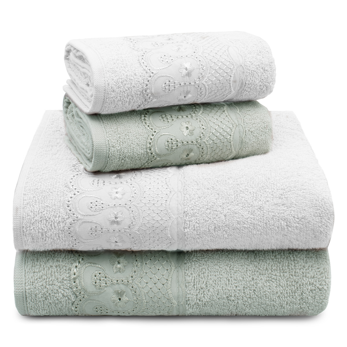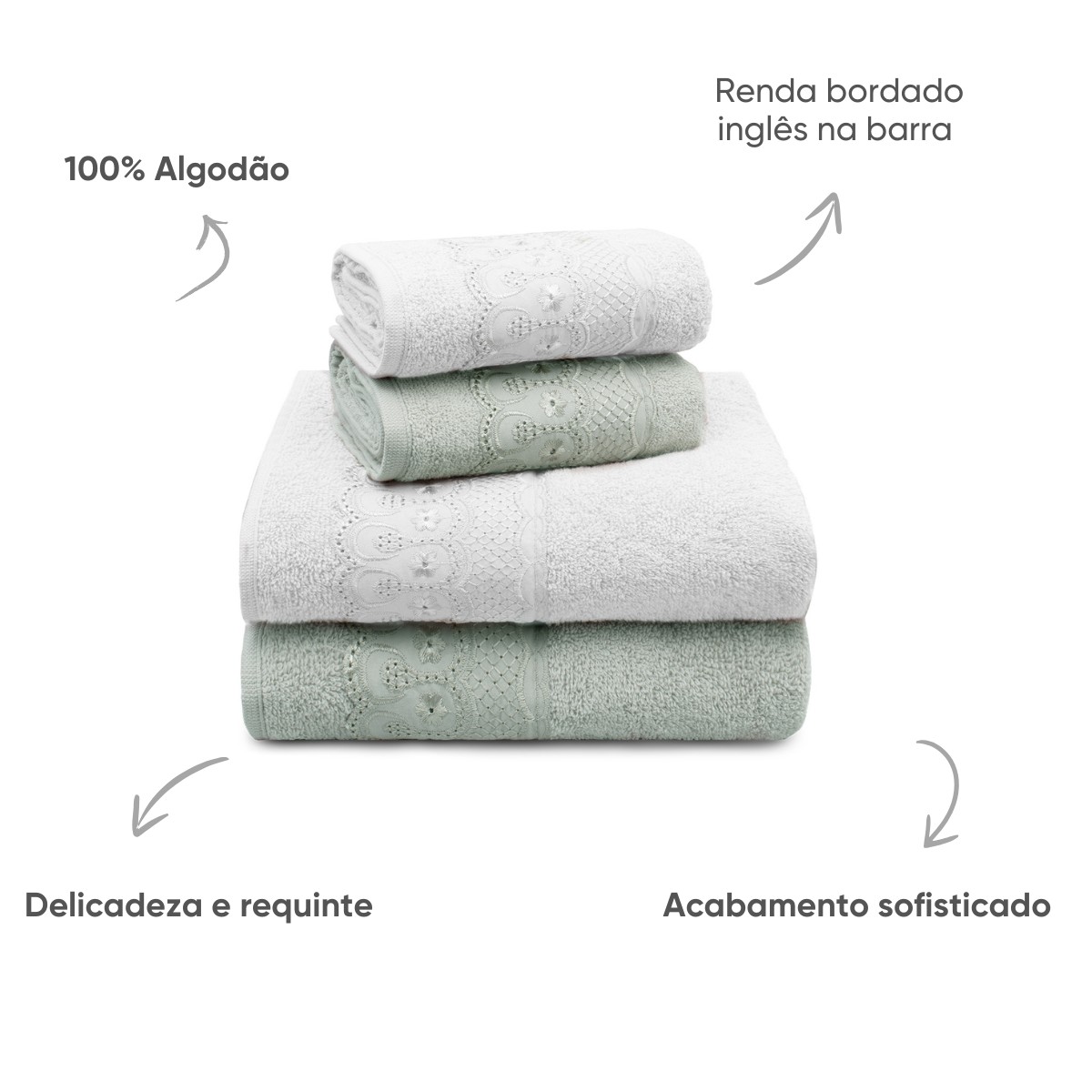 O Jogo de Toalhas 4 Peças Bordare se destaca não apenas pela qualidade, mas também pelo seu design refinado. O acabamento em fino bordado inglês adiciona um toque de elegância e delicadeza, transformando o banheiro em um verdadeiro espaço de relaxamento e bem-estar.