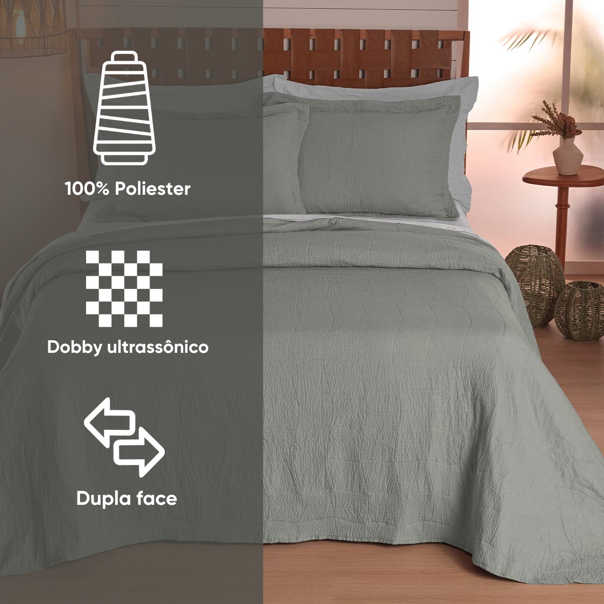 A peça é dupla face, o que permite variar a decoração com facilidade, e acompanha porta-travesseiros com abas para um visual completo na cama. É um produto confortável, resistente e com excelente custo-benefício para compor seu enxoval com estilo e funcionalidade.
