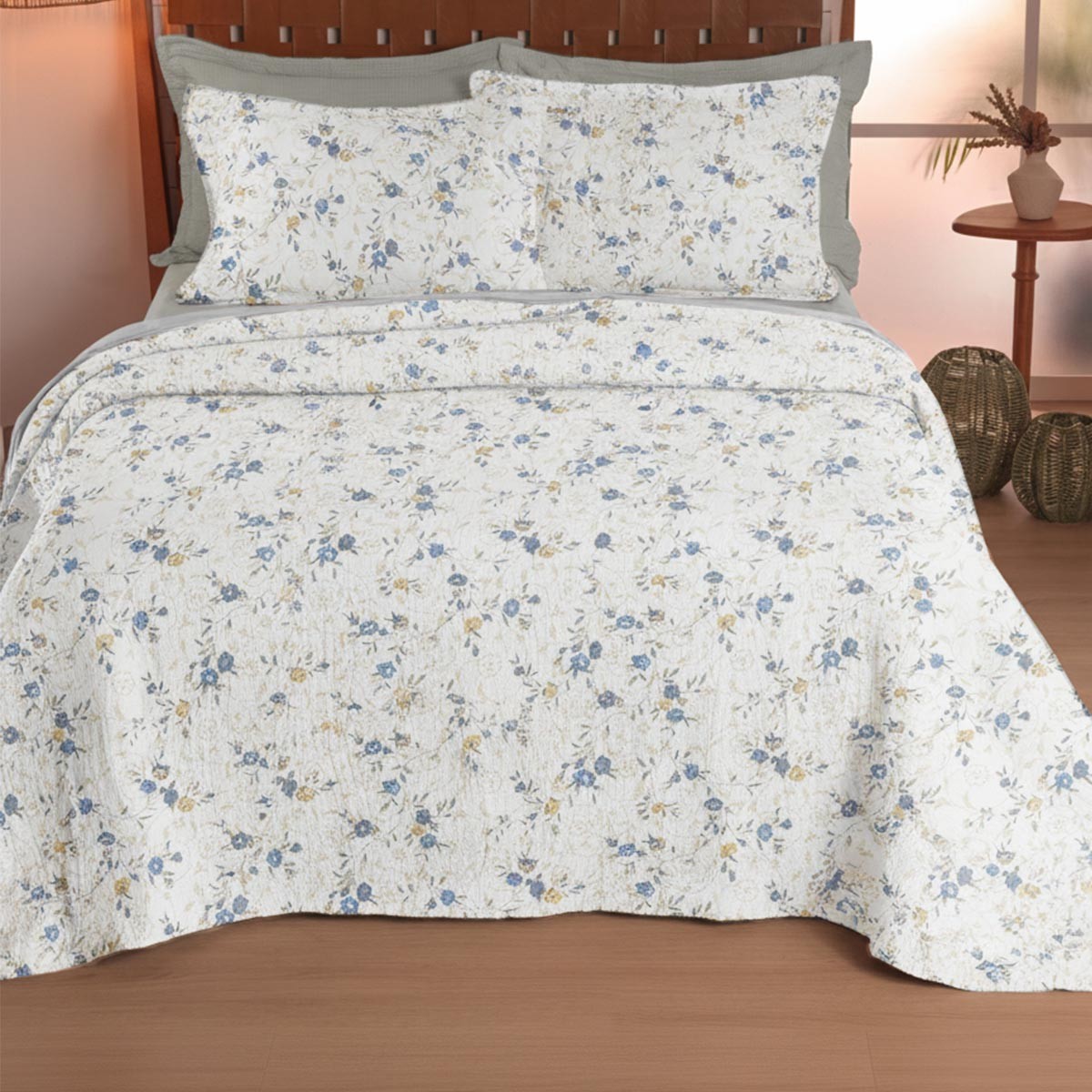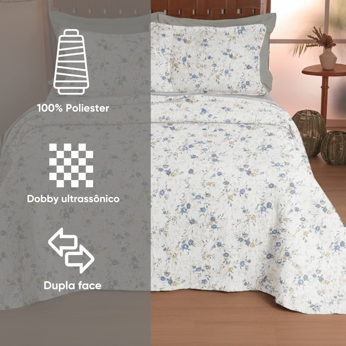 A peça é dupla face, o que permite variar a decoração com facilidade, e acompanha porta-travesseiros com abas para um visual completo na cama. É um produto confortável, resistente e com excelente custo-benefício para compor seu enxoval com estilo e funcionalidade.